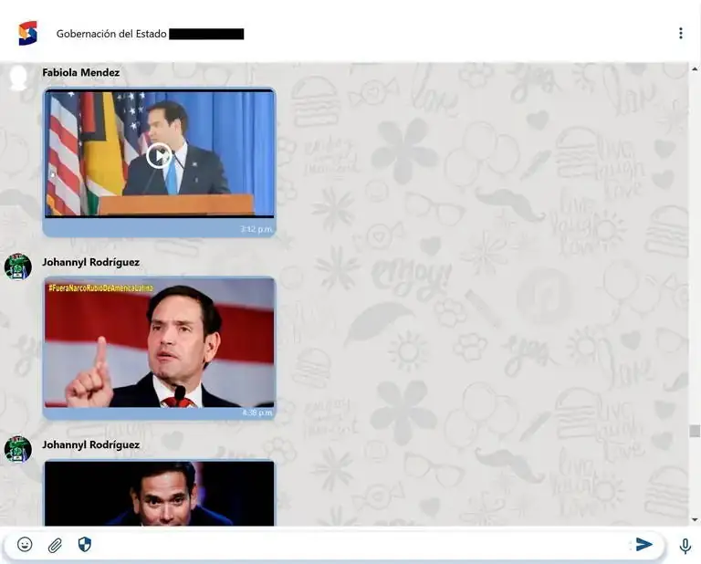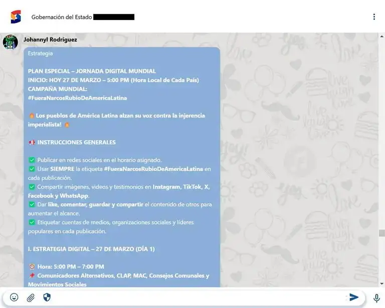 Bajo el lema “los pueblos de América Latina alzan su voz contra la injerencia imperialista”, Rodríguez envió una lista de instrucciones a los usuarios, que incluían horarios asignados para difundir en redes sociales, compartir imágenes, videos y testimonios en Instagram, TikTok, X, Facebook y Whatsapp, interactuar con otras publicaciones de otros usuarios “para aumentar el alcance” y siempre utilizar la etiqueta “#FueraNarcoRubioDeAmericaLatina”.