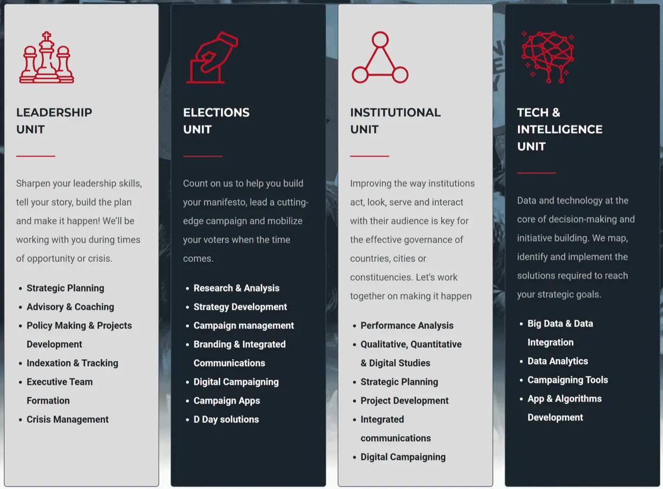 En la descripción de servicios para candidatos en procesos electorales disponible en su página oficial, Venqis ofrece servicios de planificación estratégica, manejo de crisis, administración de campañas—incluyendo las digitales—y la evaluación de su rendimiento. Adicionalmente, anuncia que hace análisis de datos, desarrollo de apps, algoritmos y manejo de big data, lo que sugiere que posee los recursos, herramientas o experiencia para procesar grandes colecciones con millones de datos: