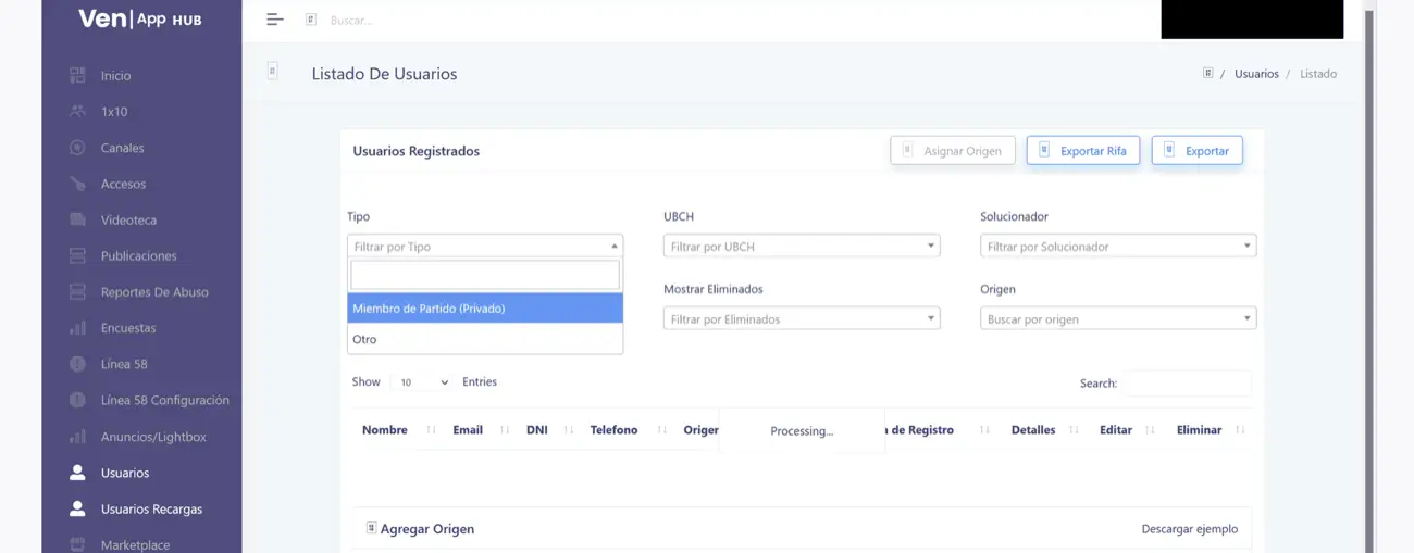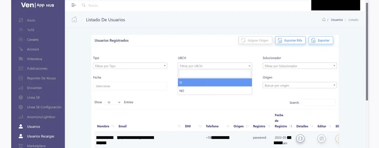 Como se puede ver aquí, en el panel de moderación de la aplicación VenApp se pueden clasificar los usuarios de acuerdo con varios campos, dos de los cuales son de relevancia organizativa y electoral para el PSUV: la afiliación del usuario a las Unidades Bolívar Chávez UBCh y si el usuario es «Miembro de Partido»: