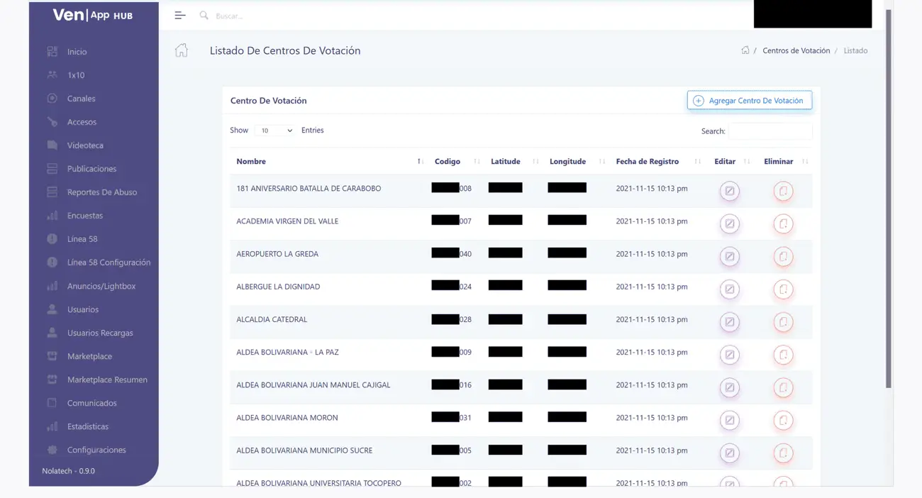 En el mismo panel de moderación existe una sección en la que se identifican 13.469 centros de votación con sus coordenadas geográficas. Esta lista fue incluida en noviembre de 2021 en la aplicación, tres meses antes de que el nombre VenApp fuera mencionado en Twitter, de forma coordinada, por la red de cuentas falsas y seis meses antes de ser presentada oficialmente, en cadena nacional, por el presidente Maduro.