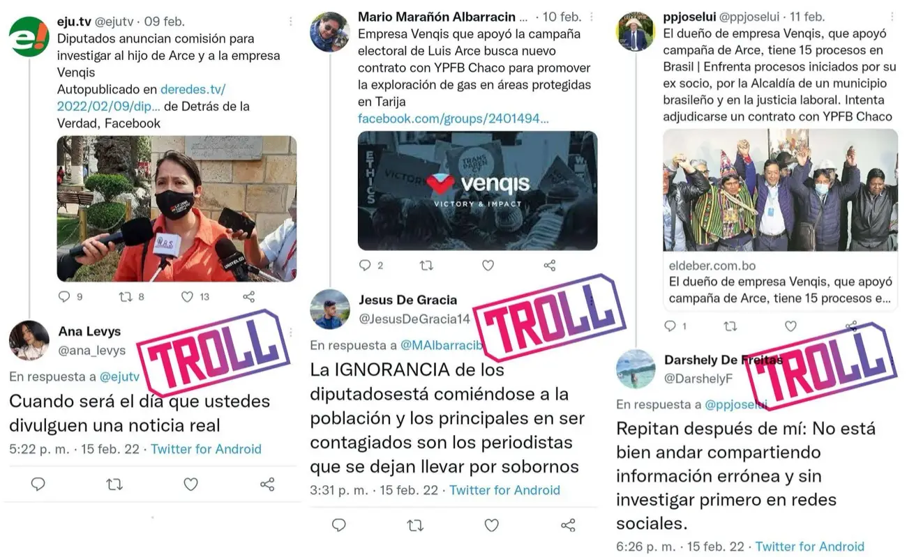 Meses antes, algunas de estas cuentas falsas habían publicado mensajes de apoyo a Luis Arce, actual presidente de Bolivia, y promovido contenido relacionado con el programa Diésel Renovable de Yacimientos Petrolíferos Fiscales Bolivianos (YPFB). Aquí se pueden ver ejemplos de cómo cuentas fraudulentas que fueron suspendidas por Twitter respondieron a tuits relacionados con Venqis publicados por cuentas bolivianas el 15 de febrero de 2022: