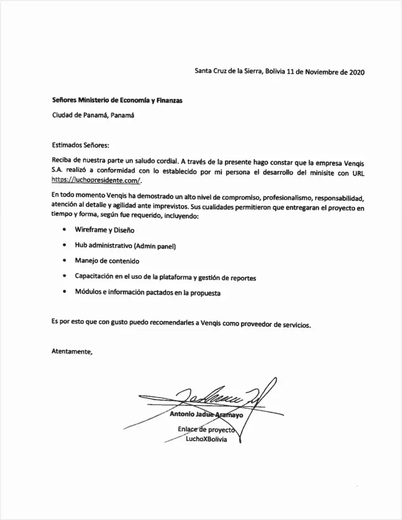 Sin embargo, esta investigación descubrió un documento que confirma la participación de Venqis, al menos parcialmente, en la campaña presidencial a favor de Arce. En una carta del 11 de noviembre de 2020, disponible en el sitio web de transparencia de la dirección general de contrataciones públicas de Panamá y entregada como parte de una propuesta de Venqis para el rediseño de un sitio web del Ministerio de Economía y Finanzas de ese país, Antonio Jadue Amarayo, presidente de la Colectividad Palestina de Bolivia, le aseguró al ministerio panameño que Venqis desarrolló el sitio web de campaña luchopresidente.com, “según lo solicitado”: