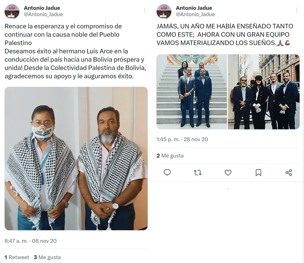 En el perfil personal de Twitter de Jadue, éste aparece en varias fotos en compañía tanto de directivos de Venqis—entre ellos Andre Golabek—como del presidente Arce, pocas semanas después de que ganara la contienda electoral del 18 de octubre de 2020.