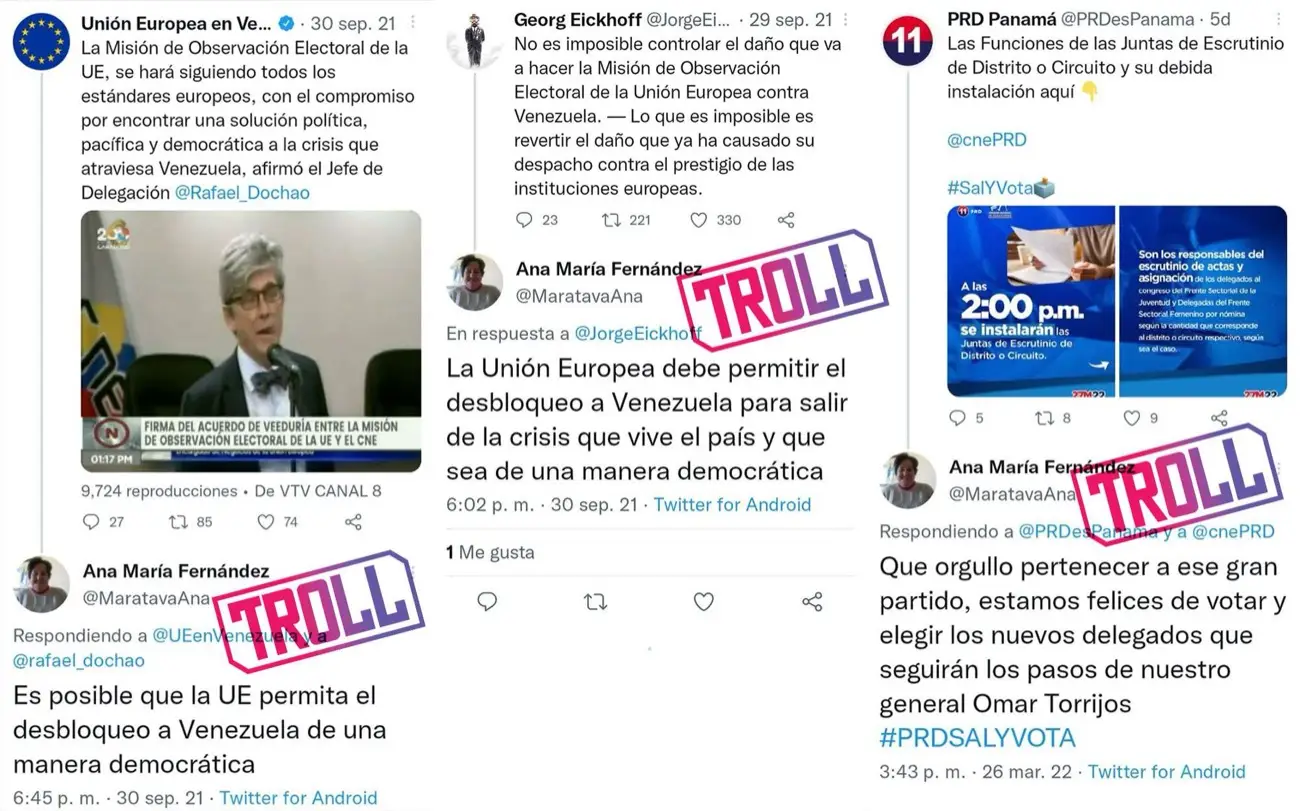 Por ejemplo, cuentas que a finales de 2021 se identificaban como usuarios de Barinas, Venezuela, publicando contenido sociopolítico para este público, cambiaron su ubicación a Panamá a principios de 2022, promoviendo entonces al Partido Revolucionario Democrático y al vicepresidente panameño, José Gabriel Carrizo. Otras que habían atacado a medios bolivianos en febrero de 2022, alzando la voz durante la polémica de Venqis en ese país, en abril de 2022 borraron todos sus tuits, cambiaron su ubicación a Panamá y seguían o eran seguidas por otras cuentas trollsque publicaron contenido propagandístico a favor del PRD.
