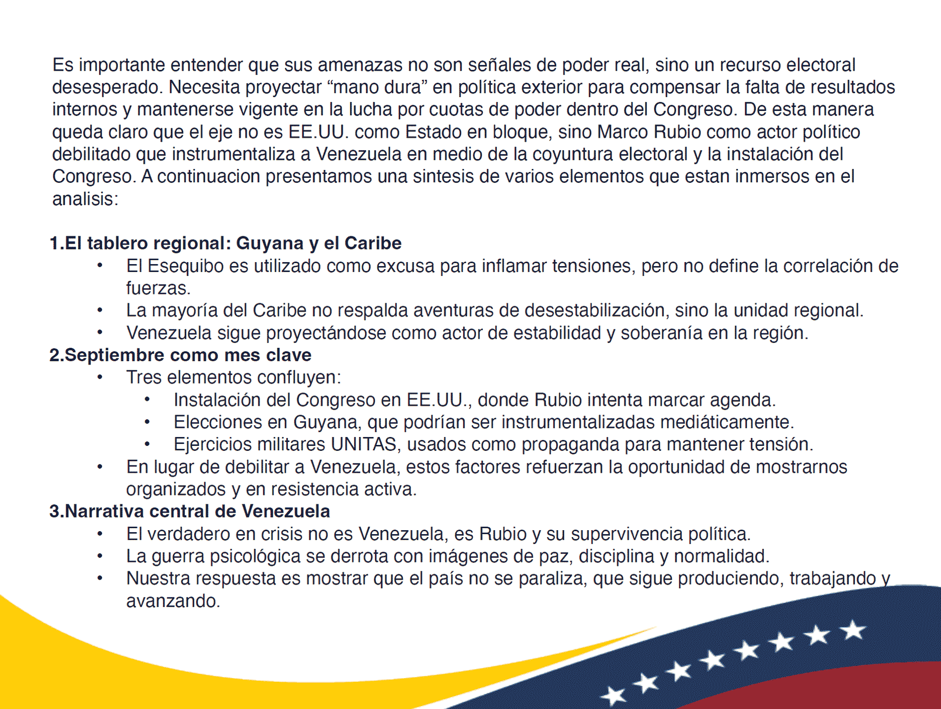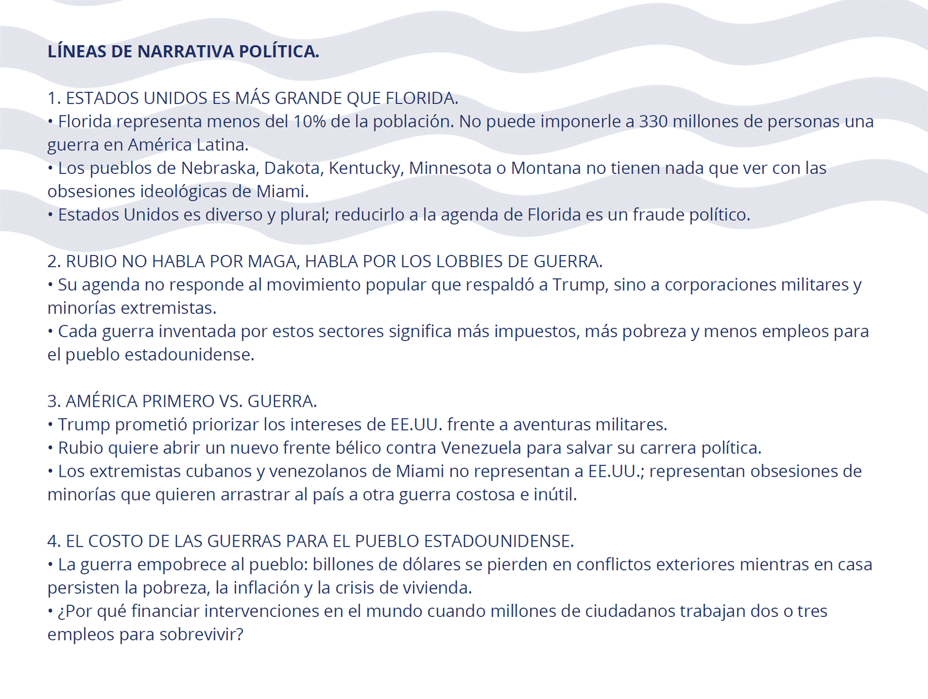Junto a las narrativas sobre America First y el gasto innecesario de recursos públicos estadounidenses, en los libretos distribuidos por Siscom también se delinea otra línea divisionista: presentar la política estadounidense hacia Venezuela como el resultado de una fractura interna, en la que una minoría —asociada al Secretario de Estado Marco Rubio y varios políticos cubanos de la Florida— arrastraría al país a una escalada no deseada por el resto de la población.