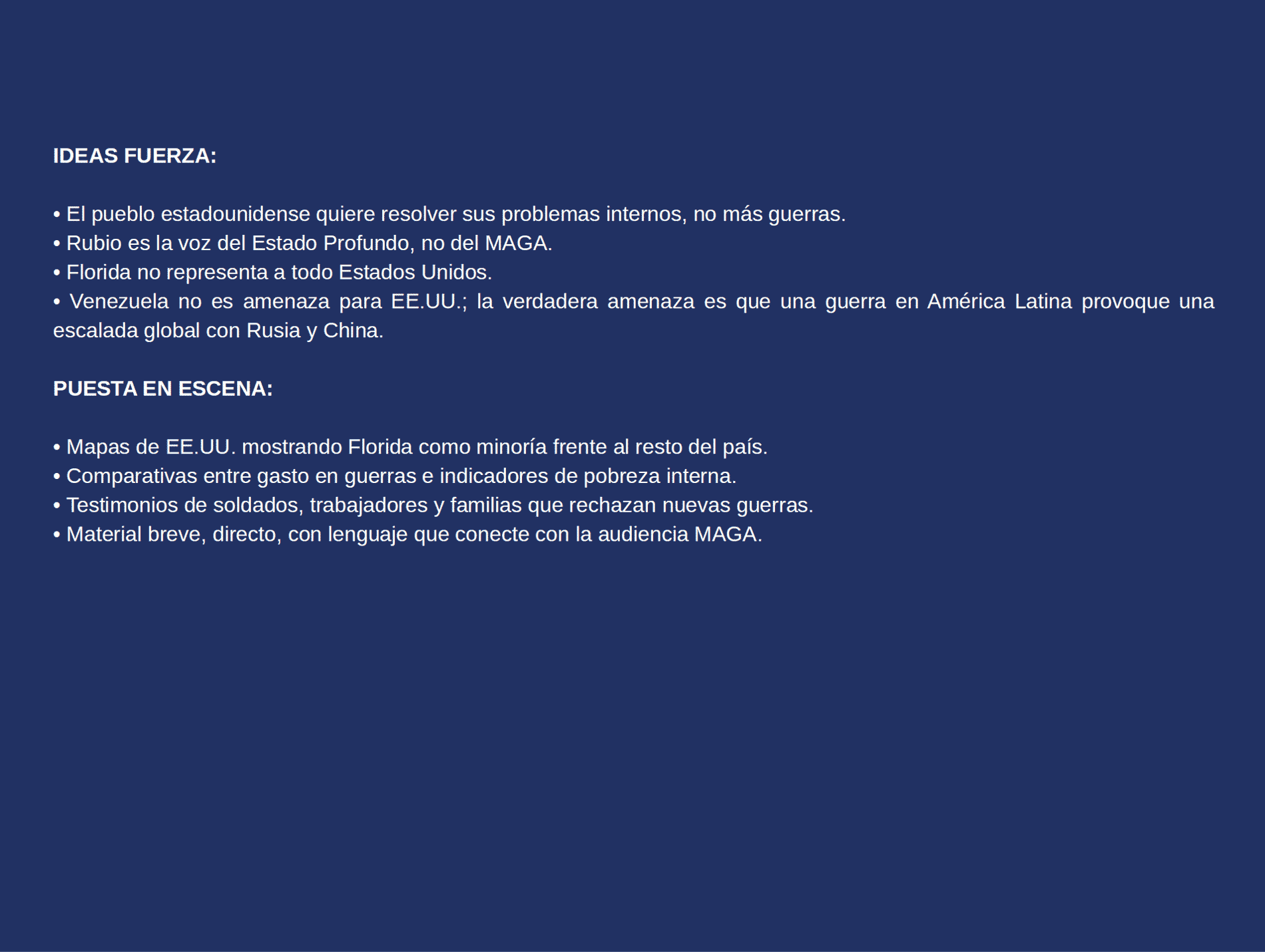 El mismo libreto enviado por Siscom el 29 de agosto, por ejemplo, define puestas en escena para contenidos que incluyan “material breve, directo, que conecte con la audiencia MAGA”. En otra de sus secciones aparecen “frases de impacto”, como “Rubio no habla por MAGA, habla por los lobbies de guerra”, “Trump defiende a América Primero; Rubio defiende primero sus intereses” o “Florida no puede imponerle al resto de Estados Unidos una guerra en América Latina”.