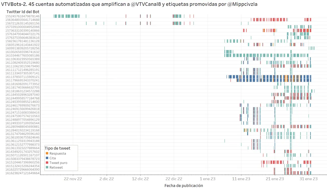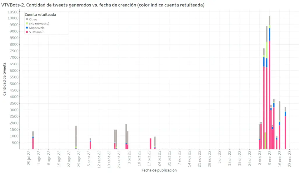 Los VTVBots-2 publicaron 56.067 tweets entre el 16 de noviembre de 2022 y el 1° de febrero de 2023. Todas las cuentas bot se encuentran activas al momento de publicar esta investigación.