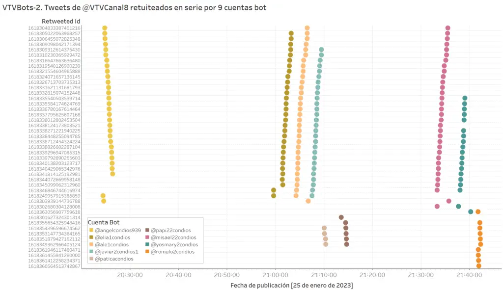 En el siguiente diagrama, cada color representa a una cuenta distinta y cada cifra a números identificación de tweets publicados por @VTVCanal8. Las cuentas bot retuitearon de forma organizada ráfagas de alrededor de 30 tweets publicados por @VTVCanal8 y, al finalizar cada cuenta, proseguía la siguiente cuenta de la botnet realizando una cantidad similar de retweets, generalmente en el mismo orden.