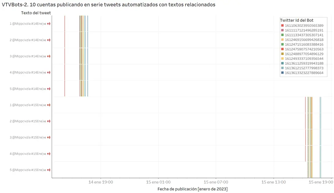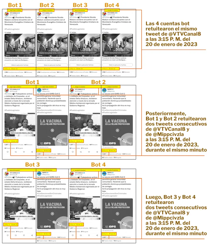 Por ejemplo, el 20 de enero de 2023 a las 3:15 P. M. (VEN), 10 cuentas de la botnet VTVBots-2 realizaron una serie de retweets —con secuencias variables— a tweets publicados por la cuenta oficial de Venezolana de Televisión (@VTVCanal8) y la del Ministerio del Poder Popular para la Comunicación e Información (@Mippcivzla):